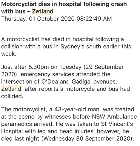 2020年9月29日,悉尼一辆公交车与陈小军驾驶的摩托车相撞,目击者表示听到剧烈撞击声,并且摩托车被拖行了数米。