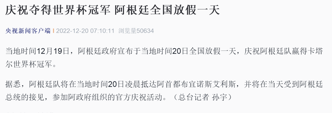 当地时间12月19日,阿根廷政府宣布于当地时间20日全国放假一天,庆祝阿根廷队赢得卡塔尔世界杯冠军。