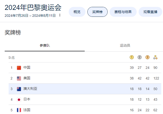 帮主撰稿时,先恭喜中国以39枚金牌反超美国、暂列奖牌榜第一,也要恭喜澳洲,本次奥运会超常发挥,以18金、18银、14铜的好成绩稳居奖牌榜第三,排在东道主法国之前。毕竟,澳洲人口只有两千六百万: