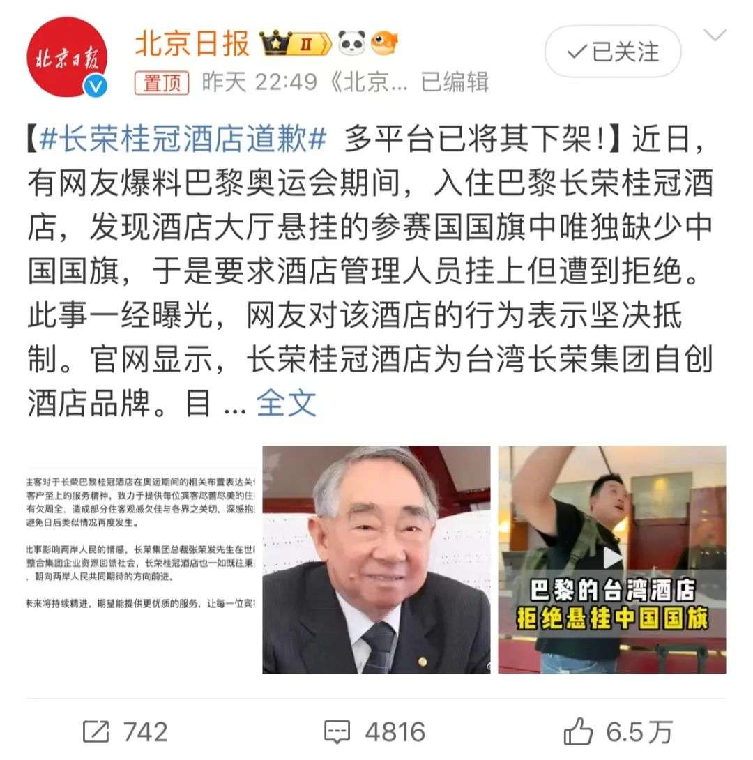 对此,北京日报发表评论称,祖国尊严不容折辱、核心利益不容挑战,这是坚定的国家意志,更是全体国民的朴素情感。目前,国内主流酒店预订平台均已下架长荣酒店,这也是砸锅者应该付出的代价。