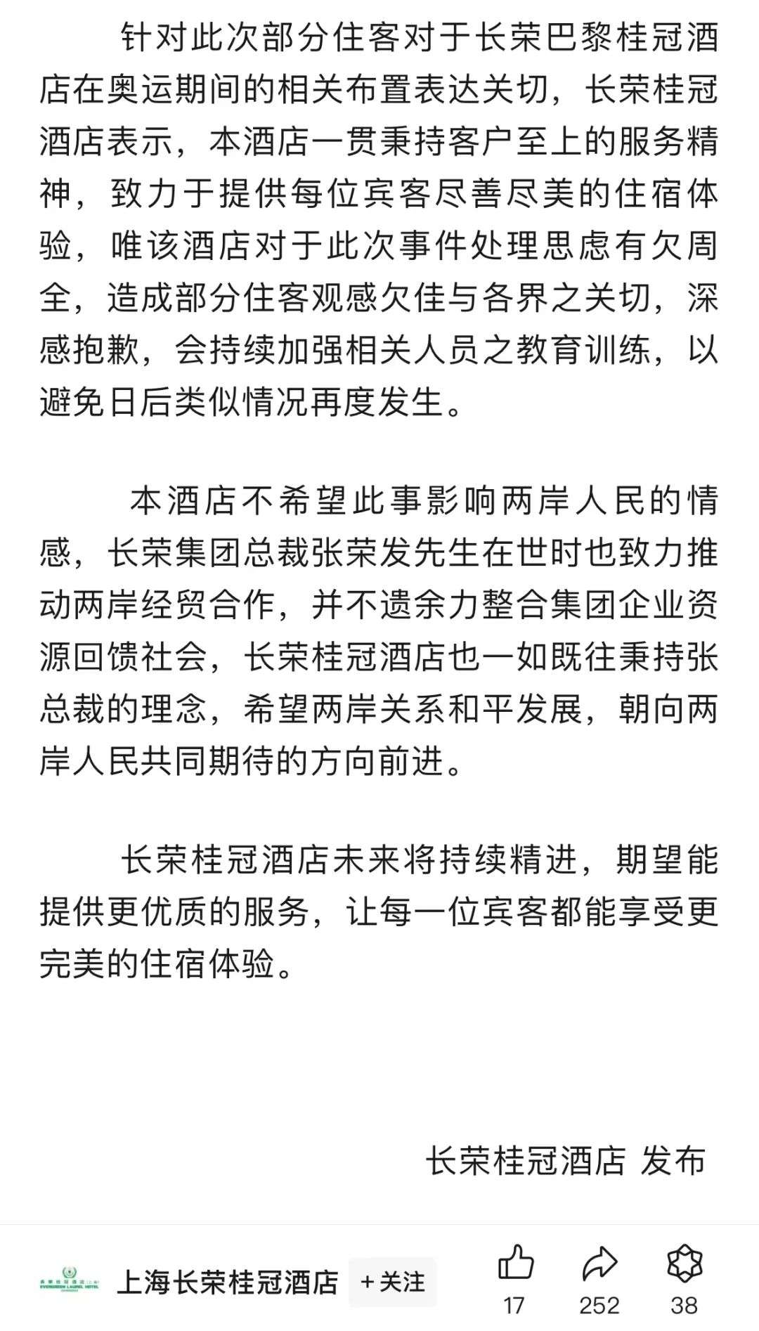 长荣桂冠酒店8月15日在上海长荣桂冠酒店微信公众号发布声明,对此事作出回应。