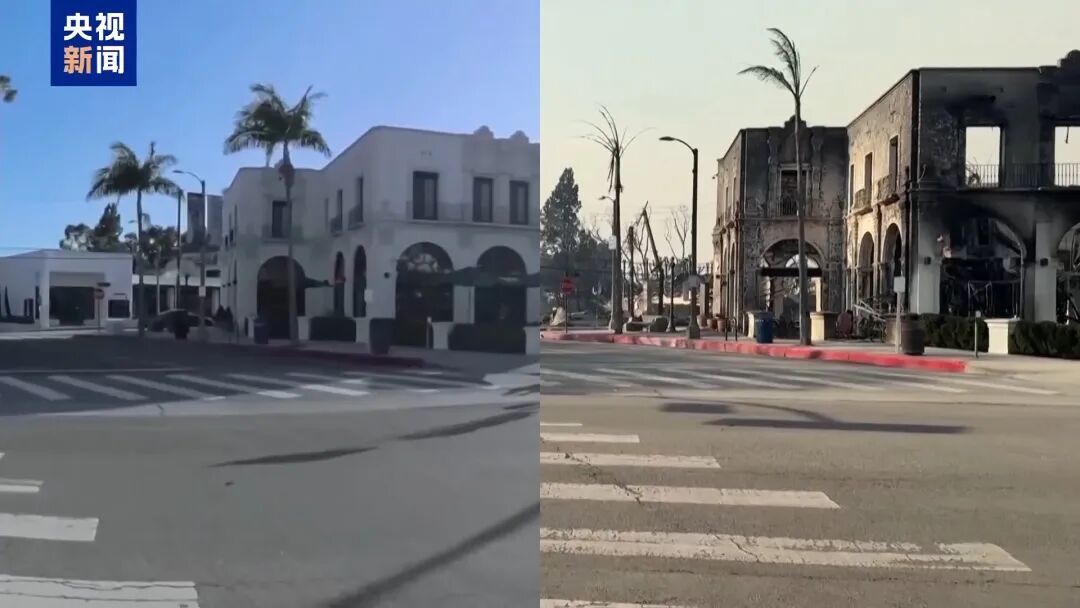 在洛杉矶太平洋-帕利塞德地区,一段去年5月和今年1月10日拍摄的对比画面显示,山火导致很多地方已经被夷为平地,房屋化为废墟,树木也被烧焦。
